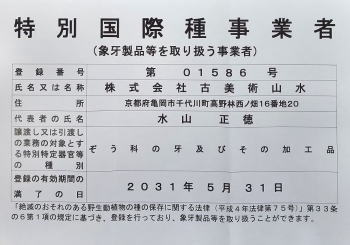 | 象牙観音像 象牙宝船 象牙根付 象牙花瓶 象牙人物像 象牙香炉 象牙麻雀牌 象牙ビリヤード玉 ※象牙の牙には、登録証が必要です。 下記より詳細を確認ください。 一般財団法人 自然環境研究センター➡ |